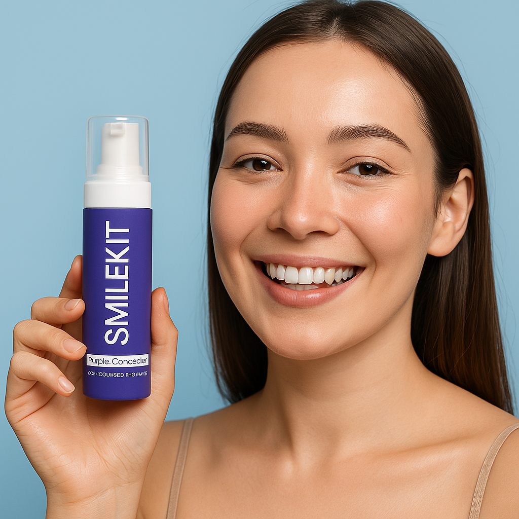 Blanquea y refresca tu sonrisa en segundos. SMILEKIT PURPLE limpia profundamente, deja aliento fresco y realza el blanco natural de tus dientes con su espuma de menta.