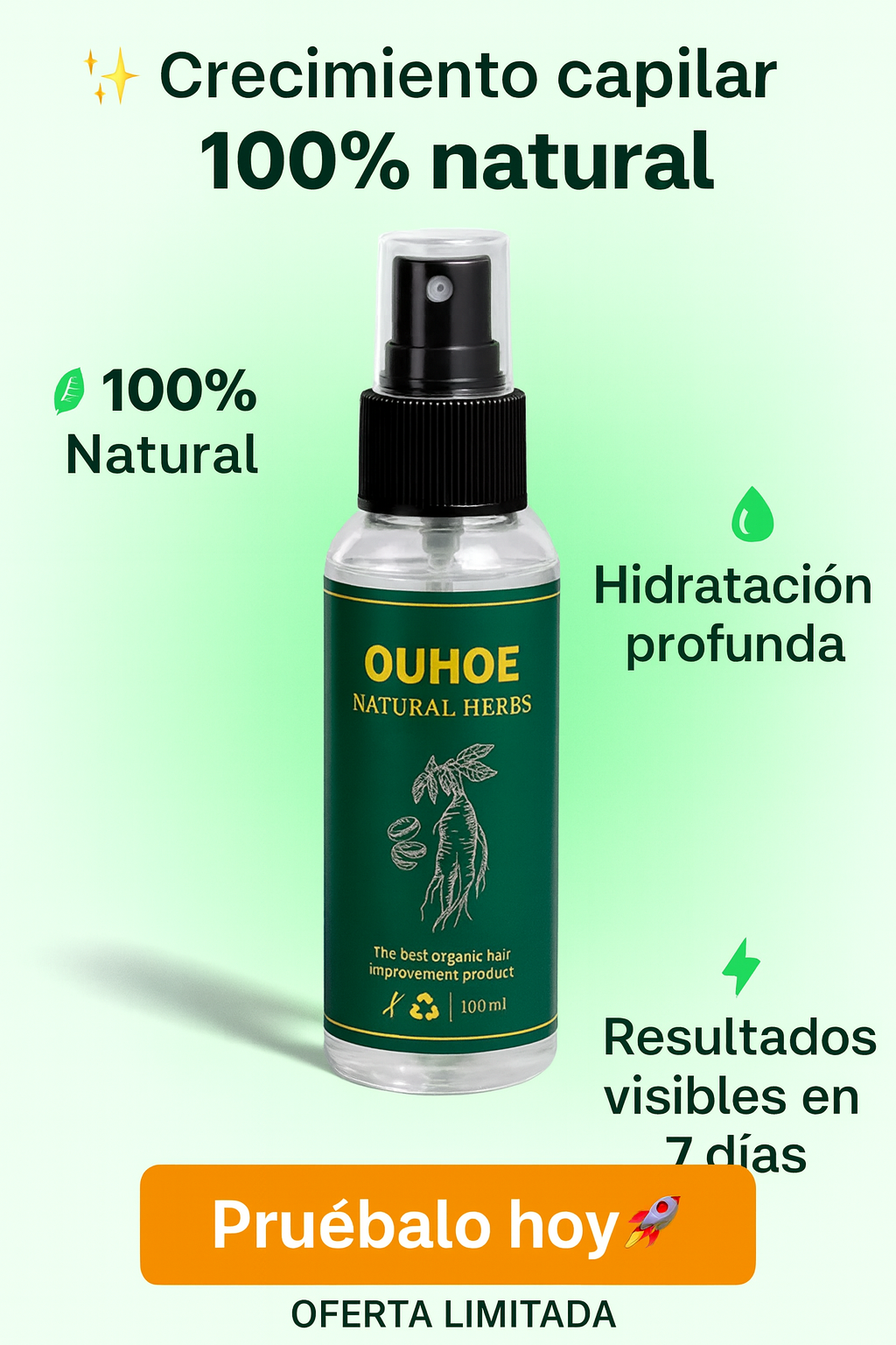 Descubre el Spray Capilar OUHOE Natural Herbs: fortalece las raíces, estimula el crecimiento y devuelve la vitalidad a tu cabello. Más volumen, fuerza y un aspecto saludable en cada aplicación.